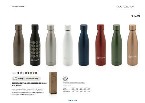Acciaio inossidabile riciclato • • Ermetica • Isolamento vuoto • Mantiene il caldo per 5 ore • Mantiene il freddo per 15 ore Dimensioni Area di stampa 110 x 219 mm Tipo di stampa Stampa digitale 360°