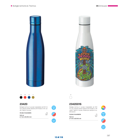 Bottiglia termica in acciaio inossidabile da 500 ml. Con doppia parete isolante (24h freddo e 12h cal- do). Tappo in acciaio.