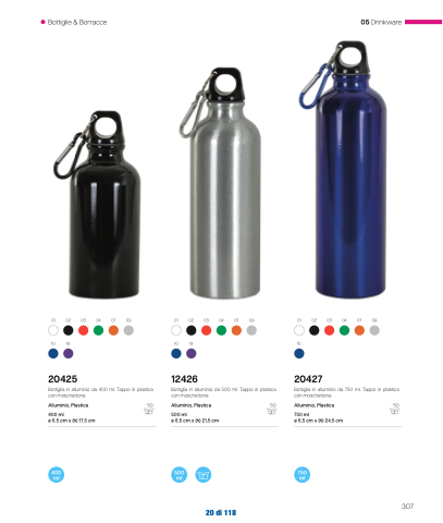 Bottiglia in alluminio da 400 ml. Tappo in plastica con moschettone.