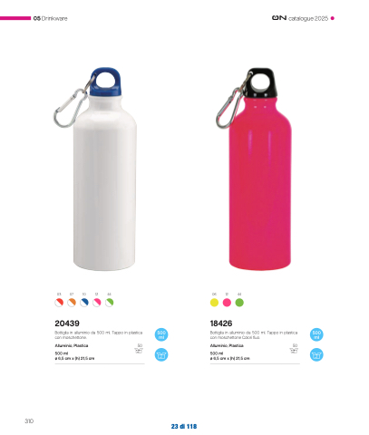 Bottiglia in alluminio da 500 ml. Tappo in plastica con moschettone Colori fluo.