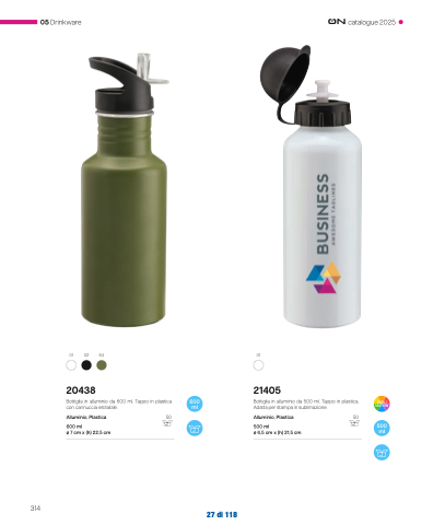 Bottiglia in alluminio da 600 ml. Tappo in plastica con cannuccia estraibile.