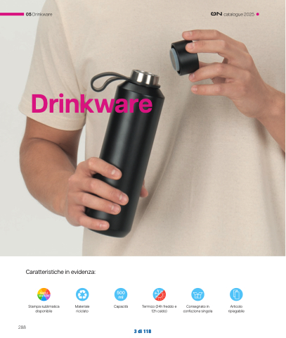 05 Drinkware catalogue 2025 Drinkware 288 3 di 118 Caratteristiche in evidenza: Stampa sublimatica Materiale Capacità disponibile riciclato Termico (24h freddo e Consegnato in Articolo 12h caldo) confezione singola ripiegabile