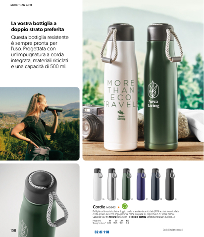 Bottiglia sottovuoto isolata a doppio strato in acciaio inox riciclato (90% acciaio inox riciclato e 10% acciaio inox) con impugnatura a corda integrata sul coperchio in PP. Senza perdite. Capacità: 500 ml. Misura Ø6,5x25 cm Tecnica di stampa Serigrafia rotativa*,RL,RD,TS,L,P