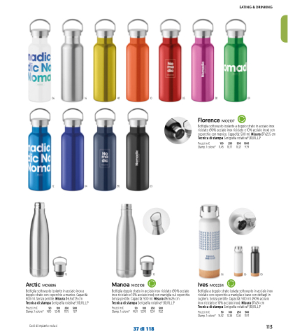 inox riciclato e 10% acciaio inox) con maniglia sul coperchio. Senza perdite. Capacità: 500 ml. Misura Ø6,5x26 cm Tecnica di stampa Serigrafia rotativa*,RD,RL,L,P