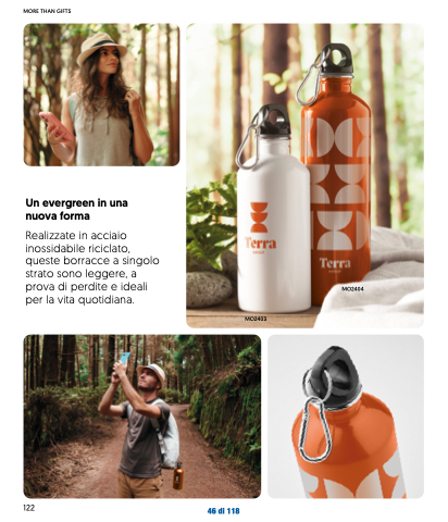 MORE THAN GIFTS Un evergreen in una nuova forma Realizzate in acciaio inossidabile riciclato, queste borracce a singolo strato sono leggere, a prova di perdite e ideali per la vita quotidiana. MO2404 MO2403 122 46 di 118