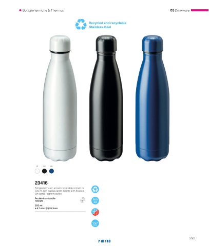Bottiglia termica in acciaio inossidabile riciclato da 500 ml. Con doppia parete isolante (24h freddo e 12h caldo). Tappo in acciaio.